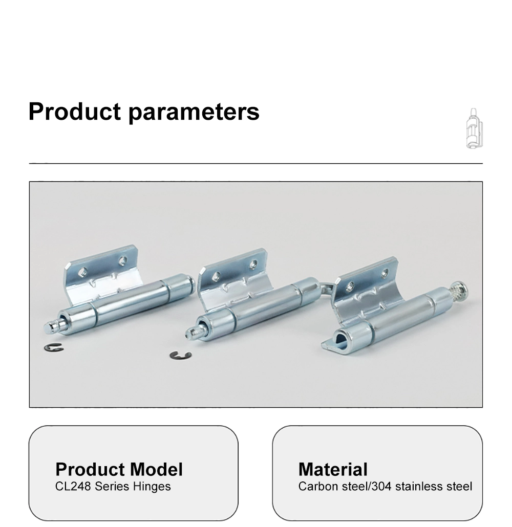Въртящата се панта на разпределителното табло поддържа закрепване с винтове и монтаж чрез заваряване. Монтажът с винтове е подходящ за стандартни шкафове от ламарина, докато заваряването се използва за рамки, изискващи постоянно позициониране на пантите. Въртящата се панта за разпределително табло CL248 пасва на различни производствени процеси на корпуси и поддържа инсталацията стабилна върху електрически шкафове и основни кутии.