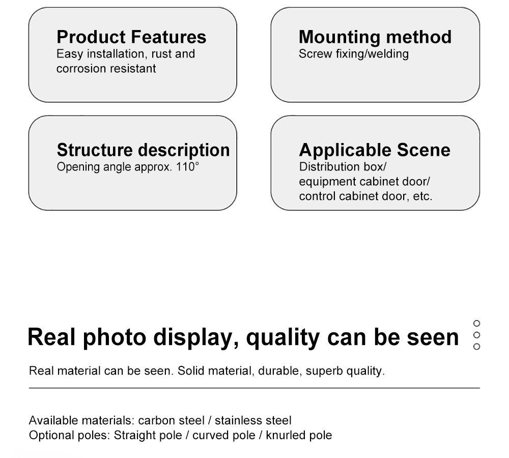 Yitai Lock разполага с въртяща се панта за разпределително табло на склад за проекти за индустриални шкафове. С ъгъл на отваряне до 110°, въртящата се панта на разпределителното табло CL248 осигурява достатъчно пространство за окабеляване, проверка и поддръжка. Може да се фиксира с винтове или заваряване на базата на структурата на шкафа. С допълнителен прав прът, огънат прът или назъбен прът, въртящата се панта на разпределителното табло се адаптира към различни оформления на рамката на вратата и методи на сглобяване.